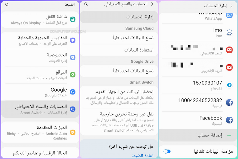 في المرة الأولى التي تقوم فيها بتشغيل هاتفك السامسونج، ستطلب منك الواجهة تسجيل الدخول أو إنشاء حساب سامسونج مباشرةً. إنه يعمل بنفس طريقة إنشاء حساب جوجل. لذلك، في حال فاتتك هذه الخطوة، يمكنك البدء على الفور. وبالتالي لإضافة حساب سامسونج على جهازك. بدايةً، توجه إلى الإعدادات> الحسابات والنسخ الاحتياطي> ثم الحسابات> اضغط على إضافة حسابات في الجزء السفلي من الشاشة> وحدد “حساب Samsung” لبدء العملية.