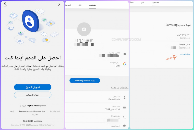 يمكنك حذف حساب سامسونج نهائيًا عبر الويب فقط. بدايةً، انتقل إلى صفحة حساب سامسونج على الويب وقم بتسجيل الدخول باستخدام الطريقة التي اخترتها؛ يمكن أن يكون باستخدام البريد الإلكتروني أو من خلال حساب جوجل الخاص بك> انقر فوق خيار “ملف التعريف” الخاص بك وهو المربع الأول في الصفحة الذي يحتوي على اسم المستخدم ومعرف البريد الإلكتروني وصورة الملف الشخصي> انقر فوق خيار إدارة حساب سامسونج> وأخيرًا، انقر فوق خيار “حذف الحساب” واتبع التعليمات التي تظهر على الشاشة بعد ذلك لحذف حساب سامسونج الخاص بك نهائيًا!