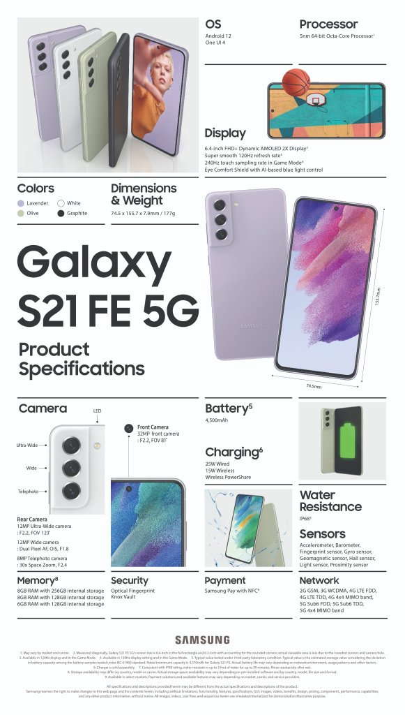 سيتوفر هاتف Galaxy S21 FE في 11 يناير الجاري بسعر يبدأ من 699 دولارًا أمريكيًا لنسخة 8 جيجابايت رام و128 جيجابايت سعة تخزين وسيصل حتى 769 دولارًا أمريكيًا لنسخة 8 جيجابايت رام و256 جيجابايت سعة تخزين، دون معلومات عن سعر نسخة 6 جيجابايت رام، فيما سيتاح بأربعة ألوان تشمل الأبيض، اللافندر، الغرافيتي، واللون الأخضر الزيتي