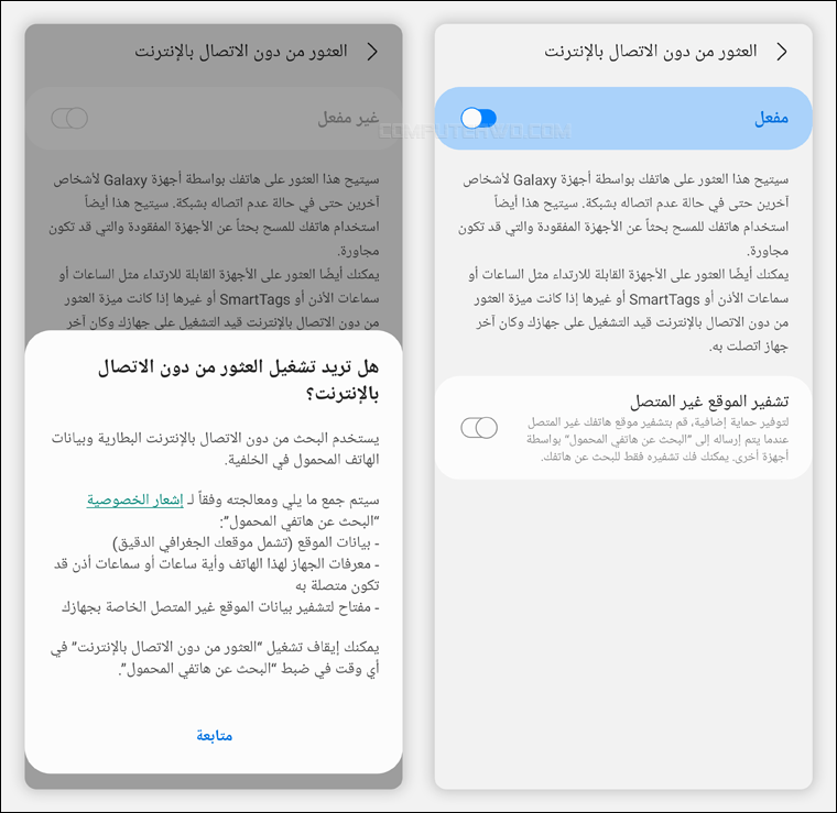 في الصفحة التي ستظهر، يمكنك تفعيل الميزة من خلال زر التنشيط الموجود بالأعلى. بمجرد أن تقوم بذلك سيظهر تحذير مفاده أن تشغيل هذه الميزة يعمل على زيادة استهلاك البطارية وذلك نتيجة احتياج وجود البلوتوث قيد التشغيل بشكل دائم في الخلفية. إن لم يكن لديك مانع اضغط “متابعة” وقم أيضًا بتفعيل خيار “تشفير الموقع غير المتصل” لضمان تشفير موقع هاتفك عند إرساله إلى أجهزة سامسونج القريبة وعلى الخوادم الخاصة بـ Find My Mobile. دعونا نوضح أكثر في الفقرات التالية