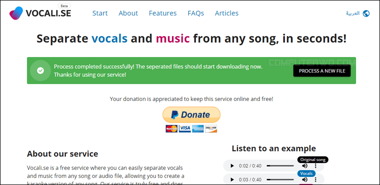 هي خدمة أخرى مجانية تمامًا حيث يمكنك بسهولة فصل الصوت عن الموسيقى في أي أغنية أو ملف صوتي، مما يسمح لك بإنشاء نسخة كاريوكي في غضون دقائق معدودة. وكل ما يحتاجه الامر هو زيارة موقع Vocali.se من خلال المتصفح ثم فتح الأغنية التي تريدها وسيتم رفعها على خوادم الموقع لتحليلها وفصل الصوت بشكل تلقائي، وهي عملية تستغرق دقيقة واحدة في معظم الأحيان لكن إذا كانت مدة الملف طويلة فبالتالي العملية ستستغرق مزيد من الوقت. في النهاية، ستحصل على رسالة تؤكد إنتهاء العملية وسيبدأ تحميلها على الفور. ما يميز هذا الموقع ان يمنحك ملف مضغوط يحتوي كلًا من ملف لصوت المغني فقط وملف آخر لصوت الموسيقى. الآن تمت العملية وبإمكانك تكرارها على أية أغاني أخرى ترغب بفصل الصوت عن الموسيقى فيها.