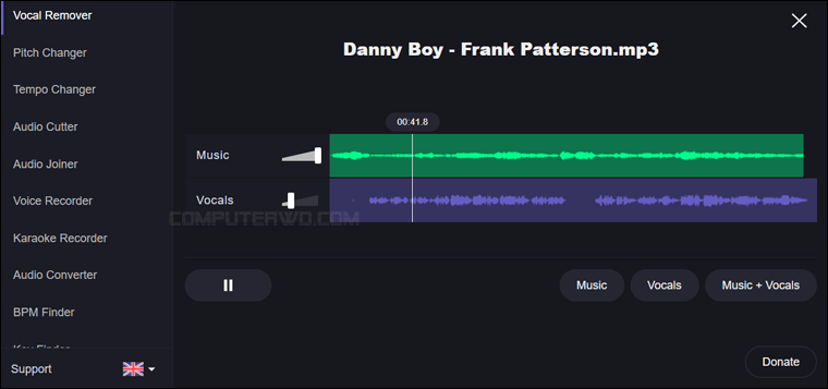 كما يوحي اسمه، Vocals Remover هو أيضًا من الأدوات الاحترافية المصممة خصيصًا لفصل صوت المغني عن الموسيقى حيث يسمح لك بإزالة الصوت البشري من أي أغنية بسهولة وبسرعة بفضل الذكاء الاصطناعي المخضرم الذي يستند إليه. الموقع يدعم ملفات الصوت بصيغة MP3 و WAV. للحصول على مقطوعة موسيقية خالية من الصوت، ما عليك سوى رفع أي أغنية إلى الموقع، وانتظر عملية التحويل، وتنزيل الصوت المحول. الخدمة مجانية تمامًا ولكن يرجى ملاحظة أنه يمكننا فقط إزالة الصوت من الأغاني إذا كانت مدة الملف لا تزيد عن 10 دقائق وحجمه 80 ميجابايت – يقول المطور أن هذه القيود ضرورية حتى لا تمتلئ الخوادم المسؤولة عن تخزين الملفات الصوتية